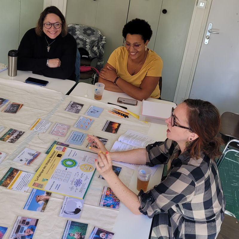 Durant cet atelier, les participantes sont invitées à positionner cinq lots de cartes qui expliquent les mécanismes de création des récits dominants et comment ils sont des verrous à la transition écologique et sociale. On apprend également que ces verrous peuvent être crochetés et on se sert de ça pour construire de nouveaux récits pendant la deuxième partie de l'atelier.